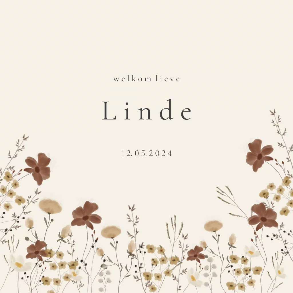 Een lief geboortekaartje voor jouw meisje. Het kaartje heeft ronde hoeken en een gebroken witte achtergrond. Daarop zie je prachtige veldbloemen in warme roestkleuren. Pas het kaartje naar wens aan in onze online editor.