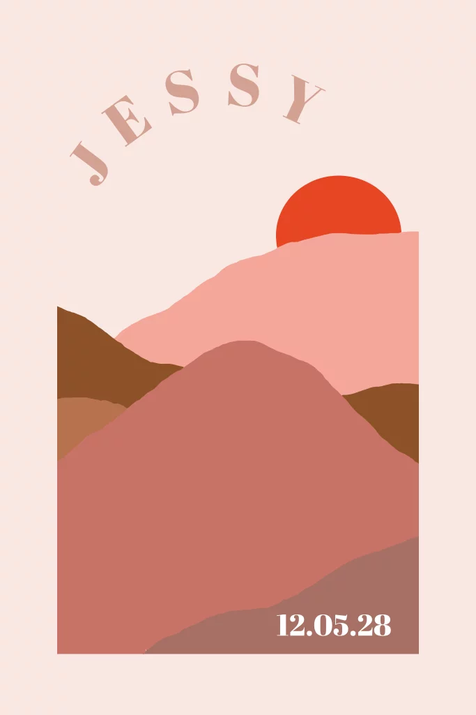 Een lief en trendy geboortekaartje voor jouw meisje. Het kaartje heeft verschillende roze en rode tinten. Je ziet een berglandschap met ondergaande zon. Bovenaan het kaartje lees je de naam van het kindje. Pas het kaartje naar wens zelf aan.