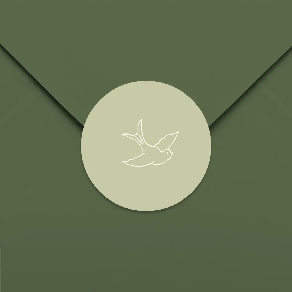Een lieve sluitsticker passende bij het geboortekaartje van onze designer Huis van Mijn. De sticker heeft een zachte groene kleur met daarop een minimalistische illustratie van een vogel. In onze online editor kan je deze sluitsticker naar wens aanpassen. De sluitstickers hebben een diameter van 35 mm en worden geleverd op vellen van 25 stuks.
