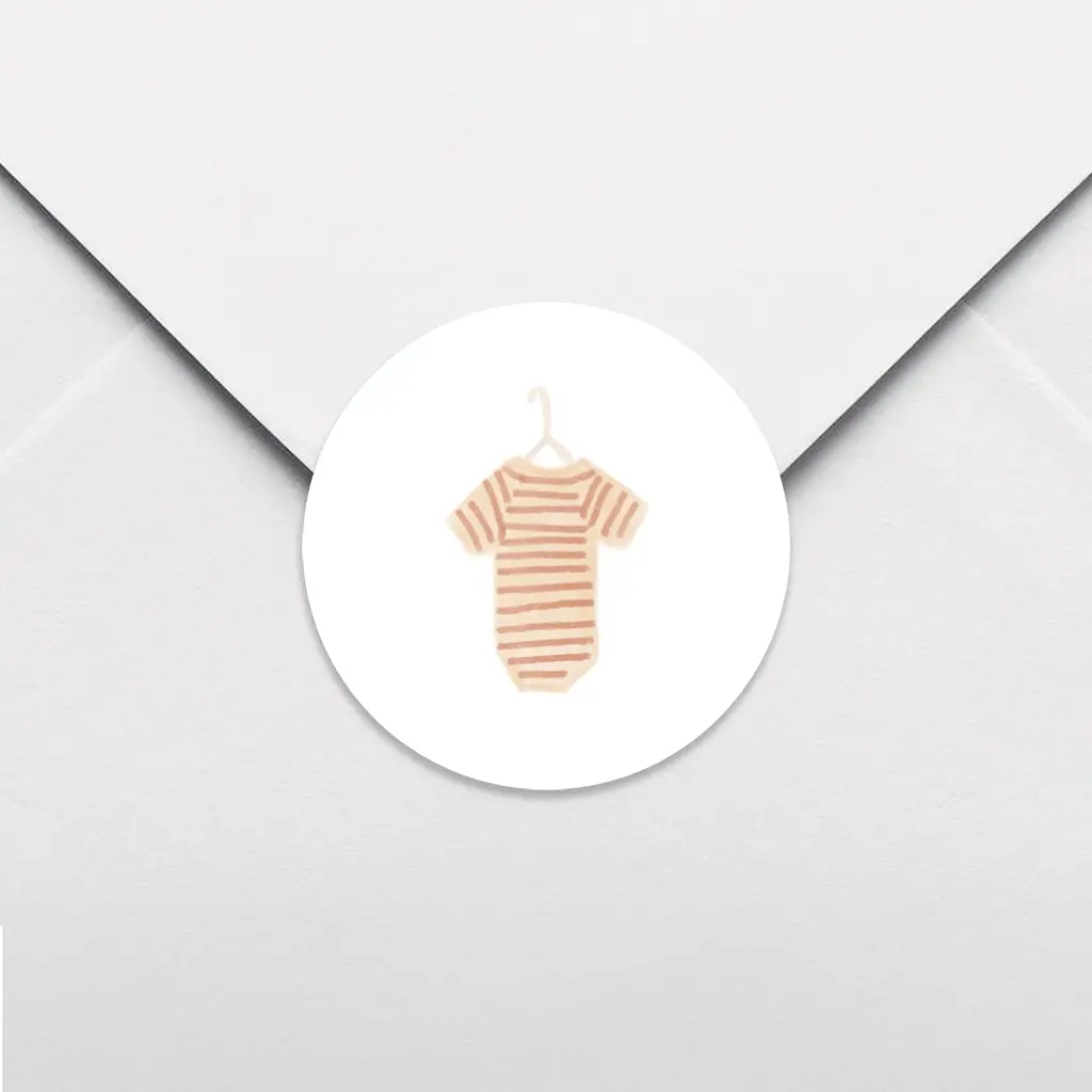 Een schattige sluitsticker voor het geboortekaartje van jouw kindje. De sticker heeft een lieve illustratie van een gestreept rompertje. Pas de sticker naar wens aan in onze online editor. De sluitstickers hebben een diameter van 35 mm en worden geleverd op vellen van 25 stuks.