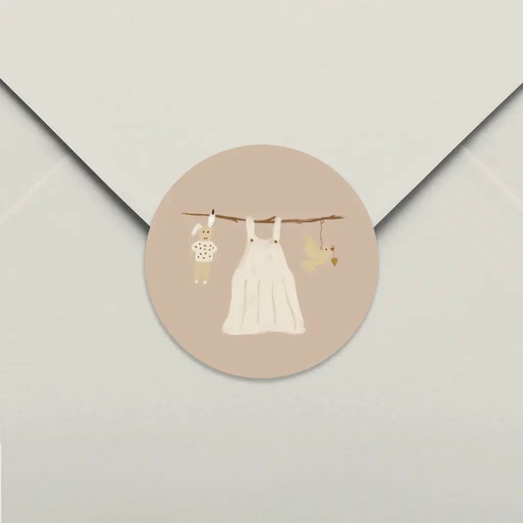 Een schattige sluitsticker passend bij het geboortekaartje van jouw kindje. De sticker heeft een aardetint als achtergrond met daarop lieve illustratie van een waslijn. De sluitstickers hebben een diameter van 35 mm en worden geleverd op vellen van 25 stuks.