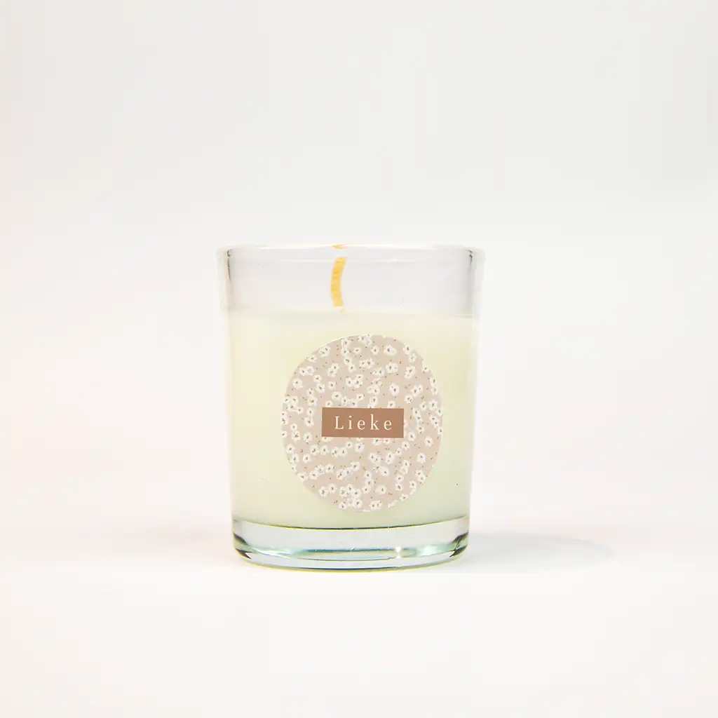 Een schattige sticker met madeliefjes voor de traktaties. De sticker heeft een oud roze achtergrond.
