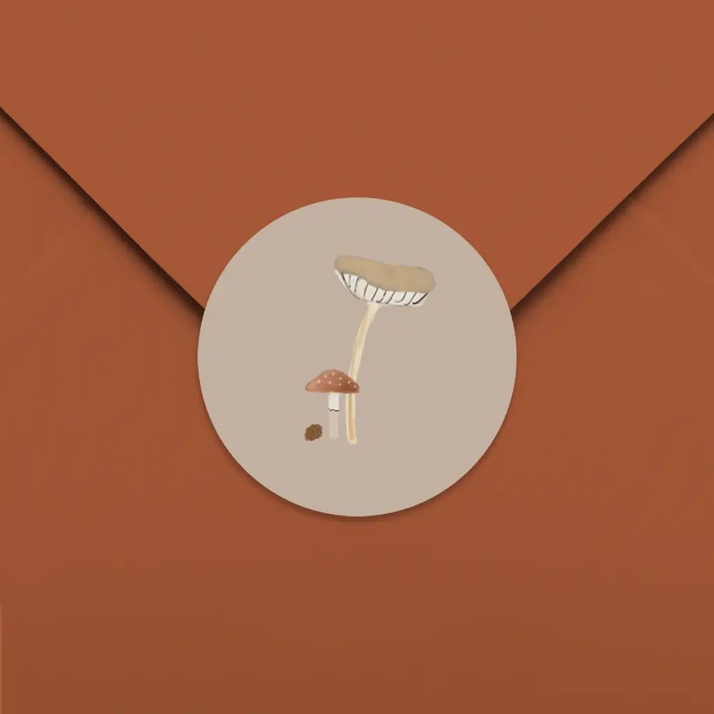 Dit is een mooie sluitsticker. De sluitsticker heft een bruine achtergrond met de illustratie van twee paddenstoelen en een blaadje. De sluitstickers hebben een diameter van 35 mm en worden geleverd op vellen van 25 stuks.