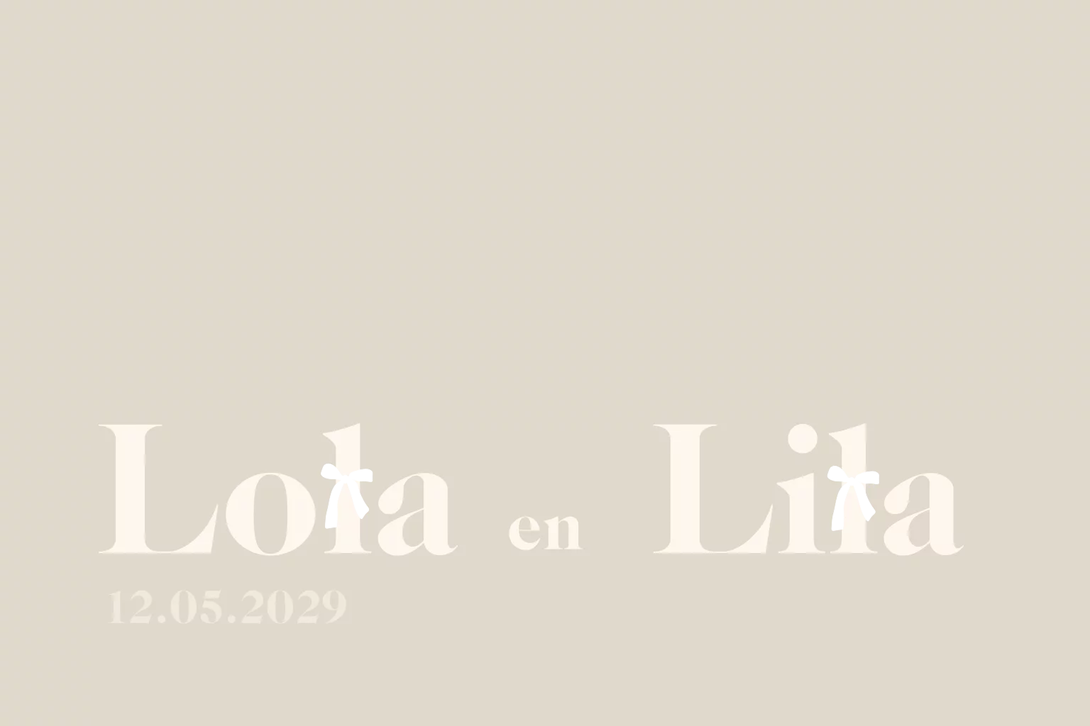 Stijlvol geboortekaartje voor de geboorte van een tweeling. Het beige kaartje is in beige tinten met strikjes van roségoudfolie om letters van de namen. Een rustig ontwerp, waardoor juist de namen mooi naar voren komen.