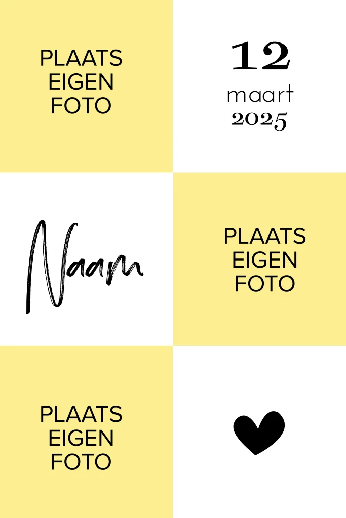 Een staand geboortekaartje met verschillende, trendy lettertypes en een lief hartje. Je kunt hier 3 eigen foto's toevoegen en zo deze collagekaart compleet maken! Welke zet jij erop?