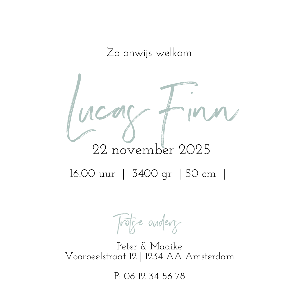 Bij dit kaartje staat de naam van jullie zoontje centraal. Wil je liever een andere kleur als achtergrond? Dit kan eenvoudig via onze editor onder het kopje 'achtergrond'. Hetzelfde geldt voor het lettertype, deze verander je gemakkelijk onder het kopje tekst.