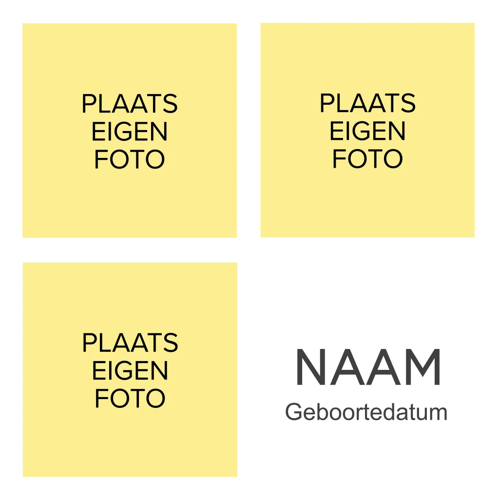 Vierkant geboortekaartje met drie foto's op de voorkant. Je kunt zelf je creativiteit gebruiken en hem naar wens maken voor jouw baby. Kijk in onze online editor voor de mogelijkheden en bestel een eerste proefdruk voor slechts €1!