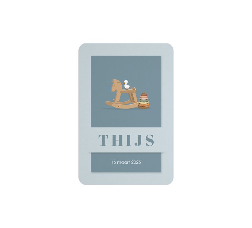 Kondig de geboorte van jullie zoon aan met dit originele kaartje. De kaart heeft een lichtblauwe achtergrond. Achter de naam kan een kleiner kaartje worden ingestoken. Op dit kaartje is kinderspeelgoed geïllustreerd. Benieuwd hoe dit kaartje er in het echt uitziet? Bestel een proefdruk en bekijk dit kaartje in het echt.
