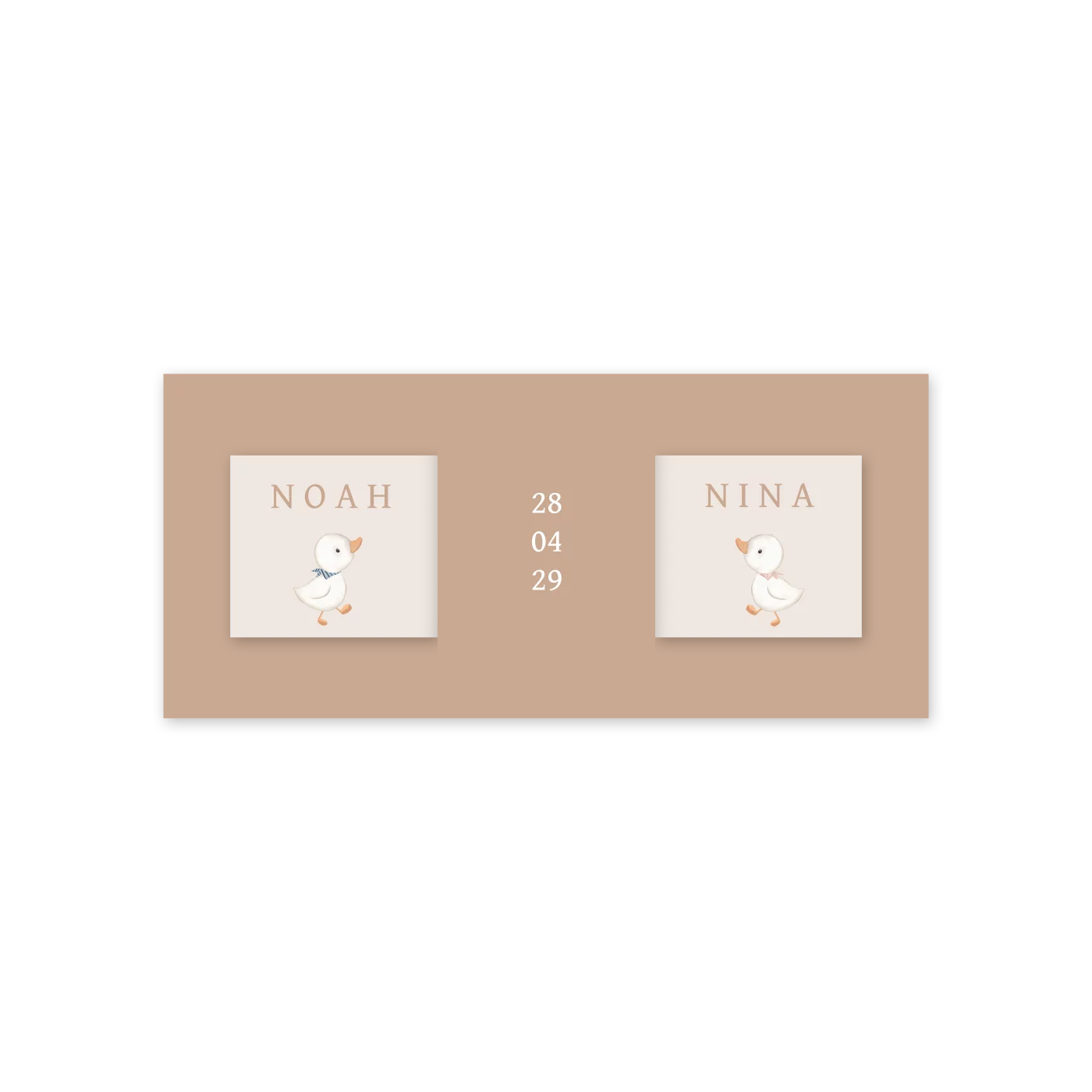 Wat een onwijs schattige kaart om de komst van jullie tweeling aan jullie dierbaren aan te kondigen! Het kaartje heeft een design in beigetinten met een insteeklabel waarop twee lieve eendjes staan. Door de insteek blijft ook de geboortedatum zichtbaar. Pas het ontwerp naar wens aan in de online editor, en bewerk bijvoorbeeld de kleuren of de tekst.