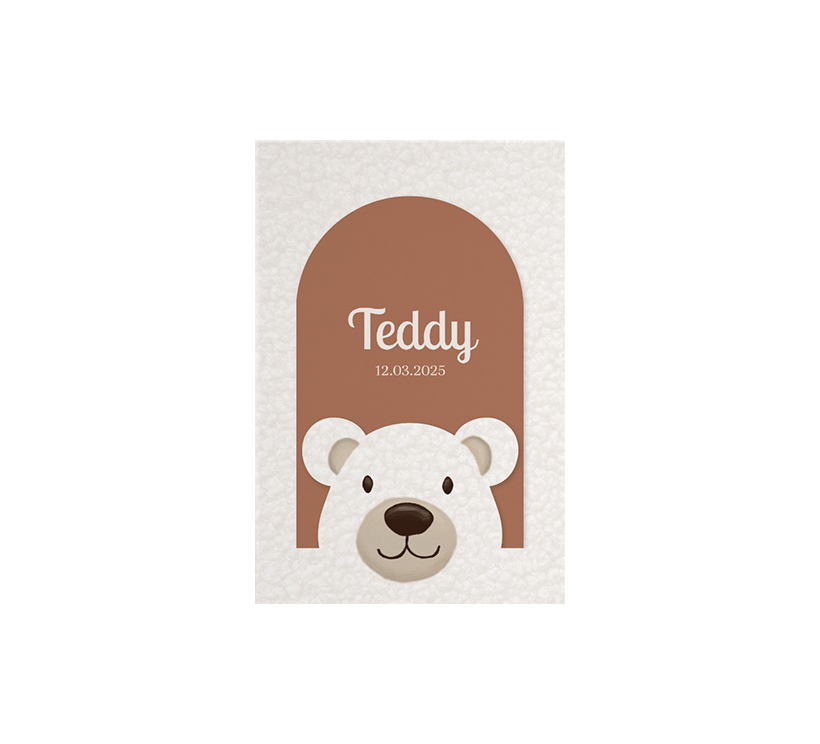 Dit is een schattig geboortekaartje voor jullie zoon of dochter. Het kaartje heeft een lichte achtergrond met teddy structuur. Achter het berenhoofd kan de kaart met arch vorm ingestoken worden. Het kaartje kan helemaal naar wens aangepast worden in onze online editor. Bestel snel een proefdruk om dit kaartje in het echt te zien.