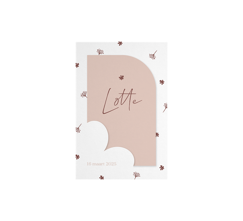 Dit is een schattig kaartje voor jullie pasgeboren dochter. Het kaartje heeft een witte achtergrond met de kleine illustraties van bloemen. Achter de uitsnede van een grotere bloem kan het kaartje met daarop de naam worden ingestoken. Het kaartje kan naar wens worden aangepast in onze online editor. De bijpassende envelop die je kunt bestellen is 12 x 18 cm, zodat het kaartje er perfect in past.