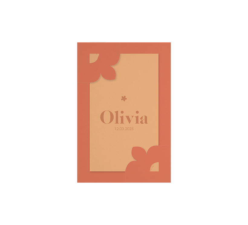 Dit is een vrolijk geboortekaartje voor jullie dochter. Het kaartje heeft een rode achtergrond. Achter de bloemen kan het kleinere kaartje worden ingestoken. Dit kaartje heeft een oranje achtergrond met de naam en geboortedatum. Pas het kaartje naar wens aan in onze online editor en bestel een proefdruk om dit kaartje in het echt te zien.