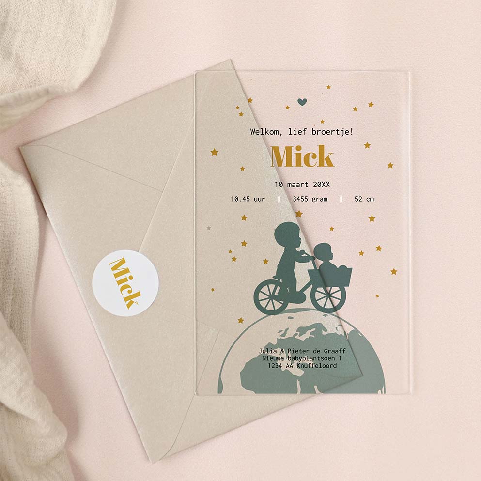 Acryl geboortekaartje met wereldbol en silhouet van broertjes op fiets