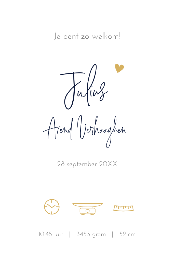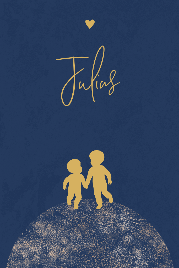Verwachten jullie een tweede kindje? Op dit lieve geboortekaartje staan de silhouetten van een grote broer hand in hand met zijn kleine broertje. Ze lopen samen op een gestempelde wereldbol. Het kaartje is uitgevoerd in donkerblauw en goudkleur. De kleuren en teksten pas je gemakkelijk naar wens aan in de online editor.