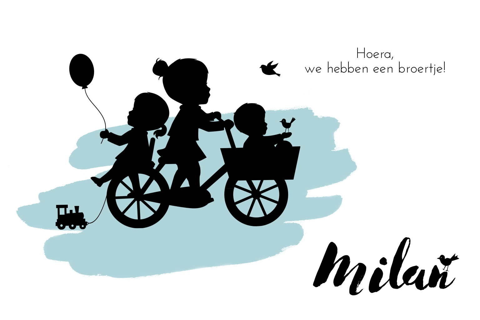 Silhouet geboortekaart jongen met zusjes op de fiets
