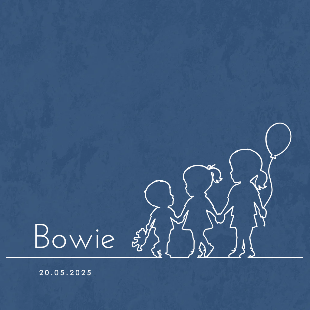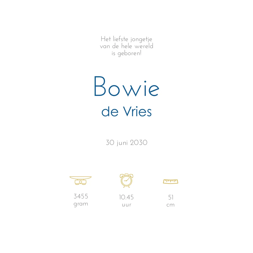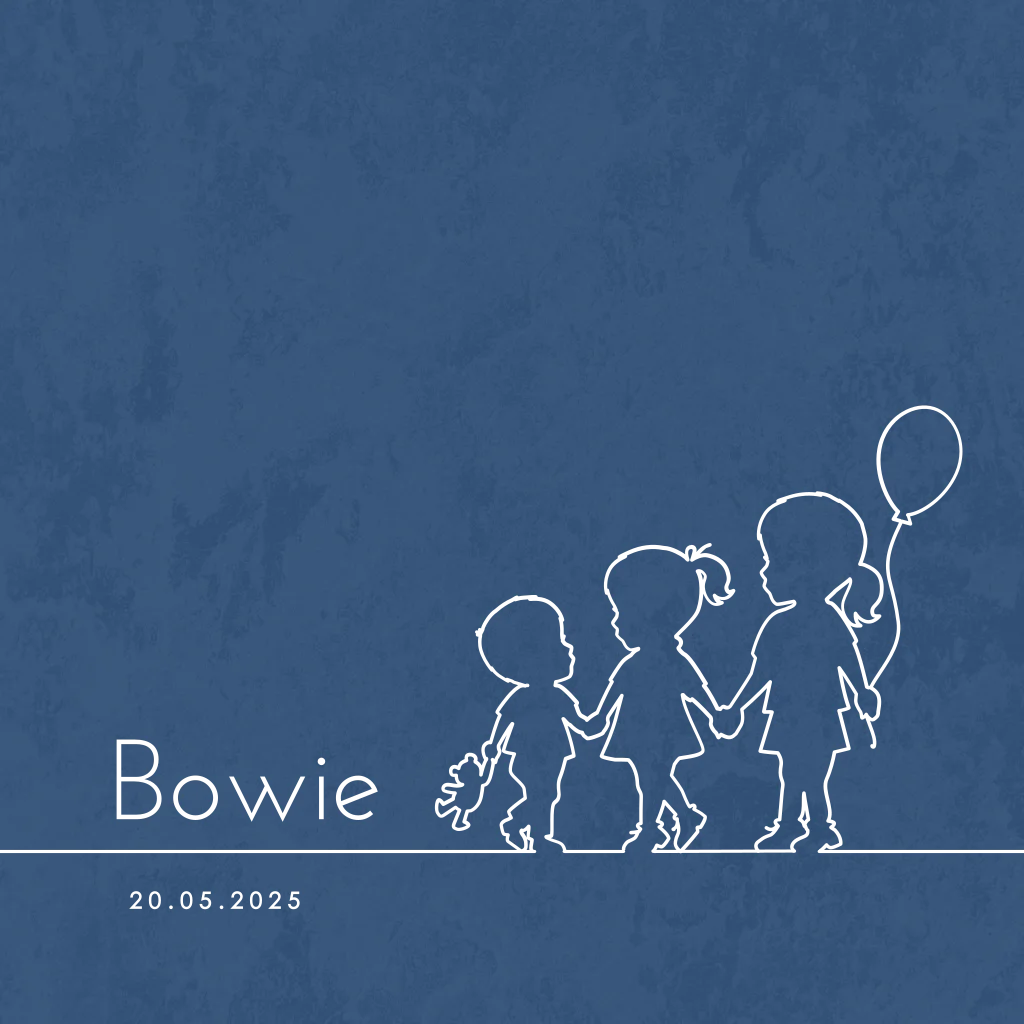 Een stijlvol en stoer geboortekaartje voor jouw derde kindje. Het kaartje heeft een blauwe achtergrond met daarop een goudfolie lijntekening van drie silhouetjes. Neem contact met ons op voor een illustratie voor een eerste of tweede kindje of voor een andere gezin samenstelling.