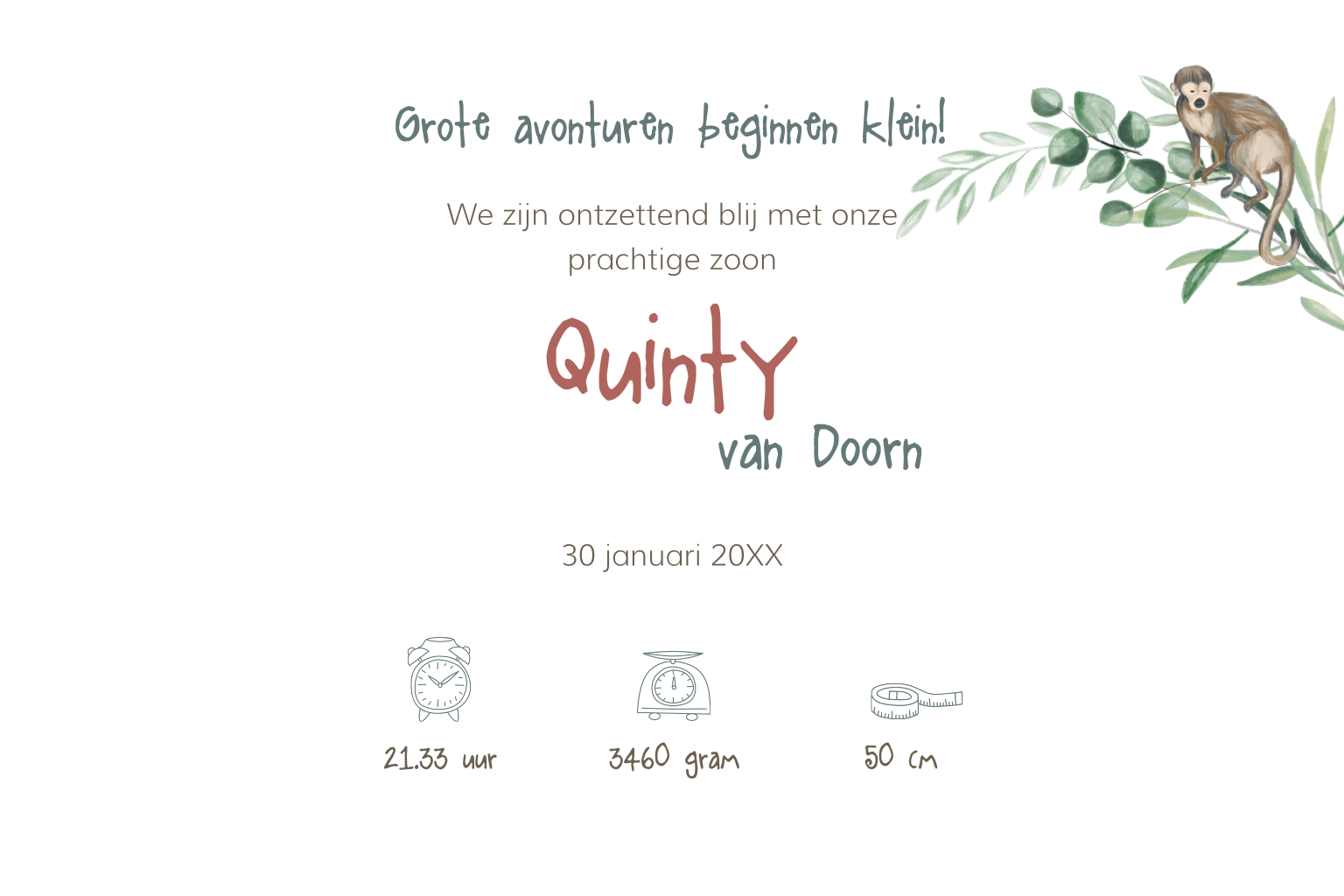 Lief jungle geboortekaartje voor zoon met olifant en aapjes