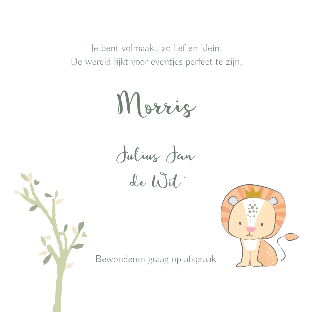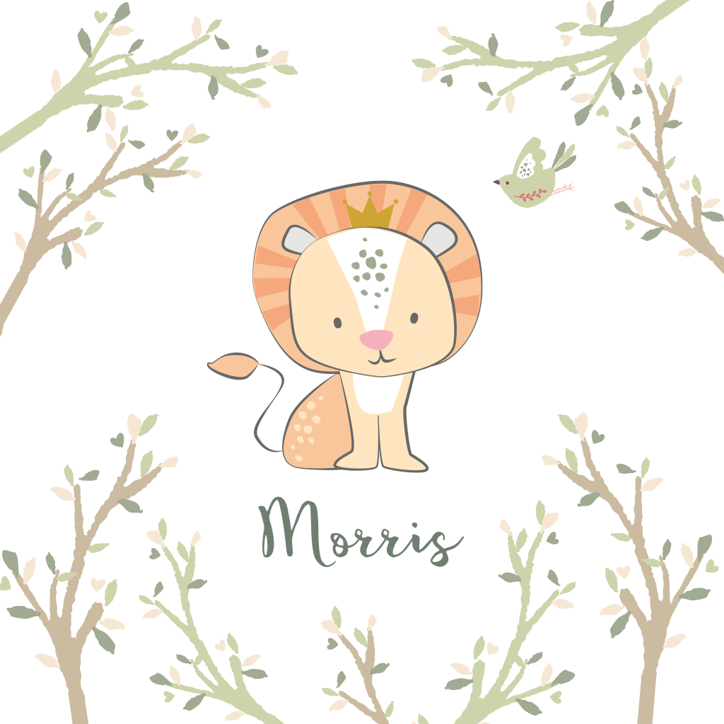 Wat een lief geboortekaartje voor een pasgeboren zoontje! Het leuke, getekende leeuwtje met kroontje is omringt door sierlijke boomtakken in groen en bruin en een vogeltje. Maak hem compleet met eigen teksten in de lettertypes naar wens!