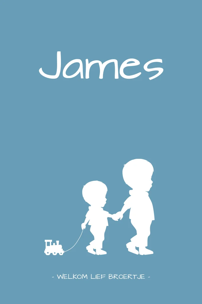 Lief blauw geboortekaartje voor de geboorte van je tweede kindje met een silhouet van kleine broertje met zijn grote broer die samen met de trein spelen