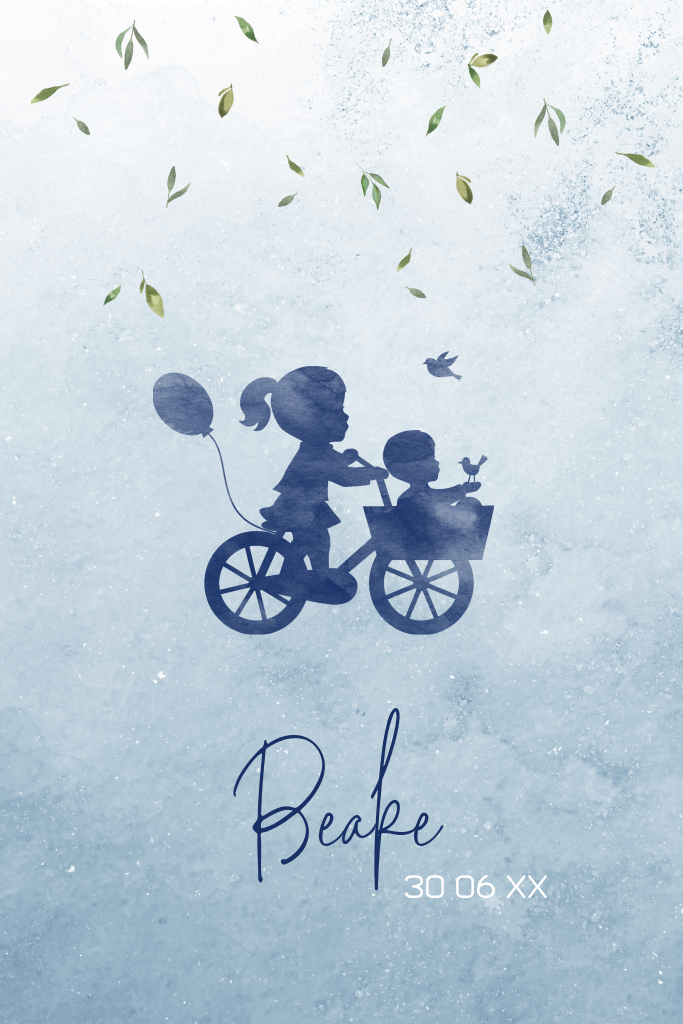 Blauw geboortekaartje met silhouetjes van broertje en zus op fiets