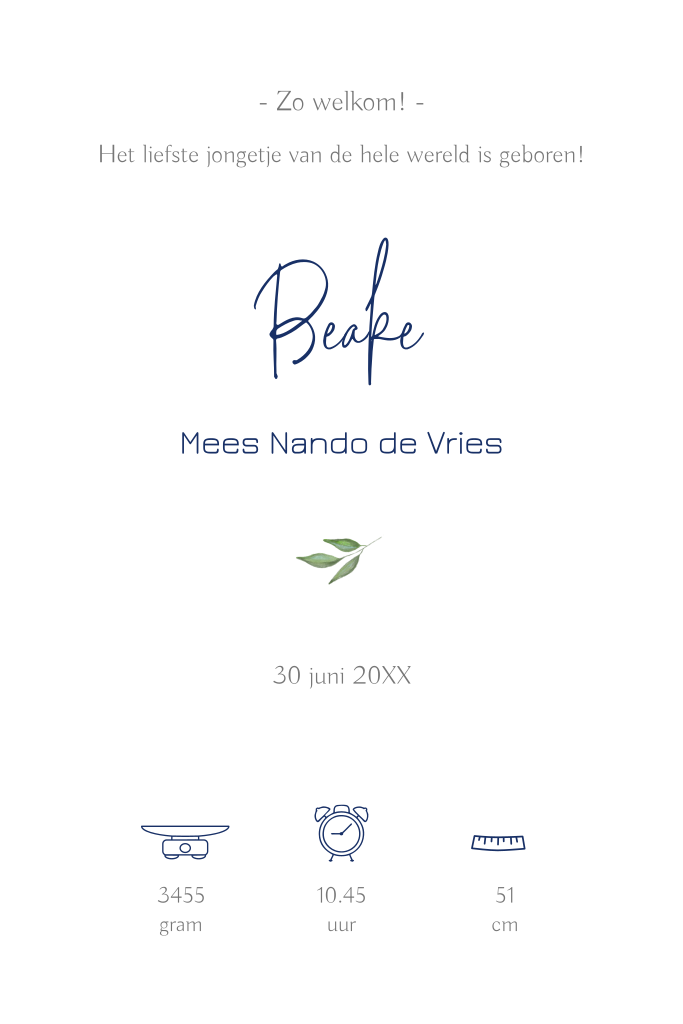 Kondig de geboorte van jullie zoon en broertje aan met dit schattige kaartje! Centraal op het kaartje staan de silhouetjes van een grote zus met haar kleine broertje op een fiets. De kleine groene blaadjes in de lucht maken dit kaartje helemaal compleet. Pas het kaartje naar wens aan in onze online editor.
