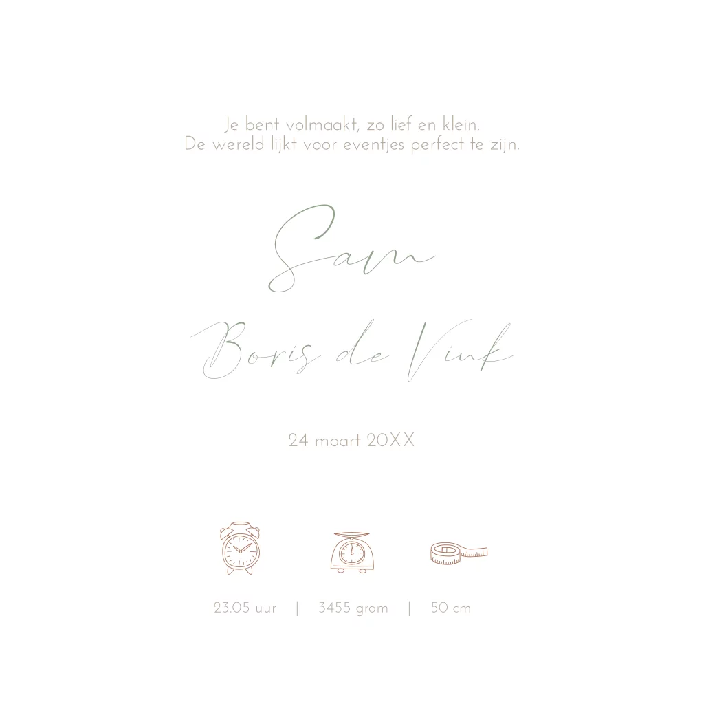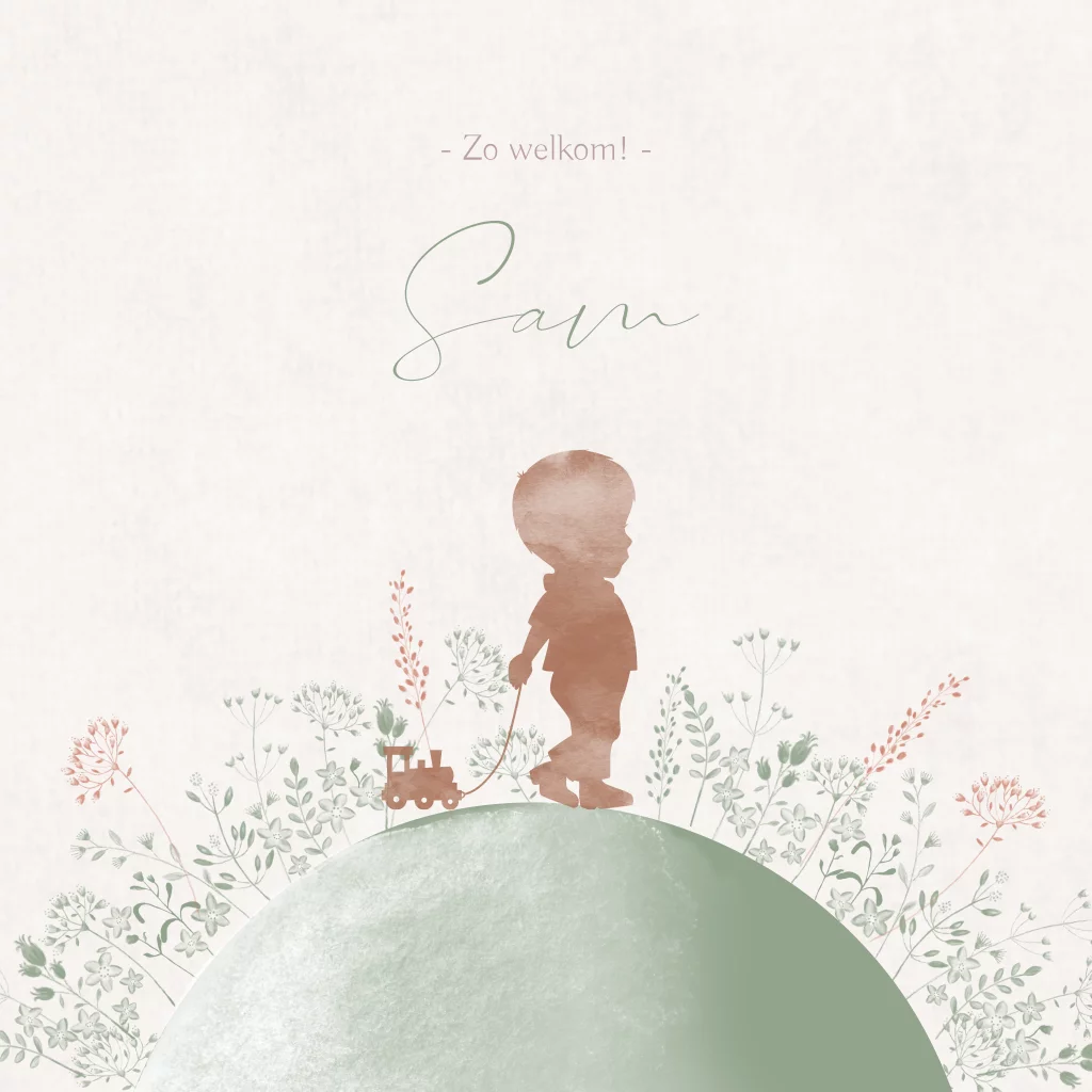 Dit hippe geboortekaartje voor jouw zoontje. Het kaartje heeft groene details met wereldbol en bloemen. Op de wereldbol zie je een silhouetje. Pas de kleuren, tekst en het lettertype naar wens zelf aan. Bestel een proefdrukje om deze kaart in het echt te kunnen zien.