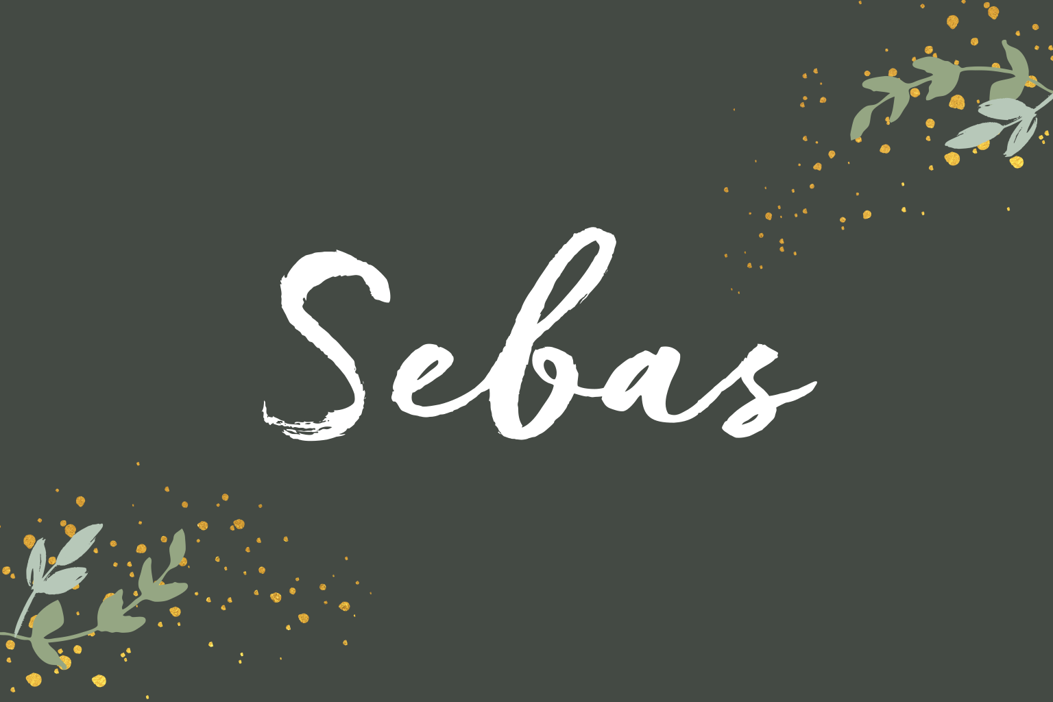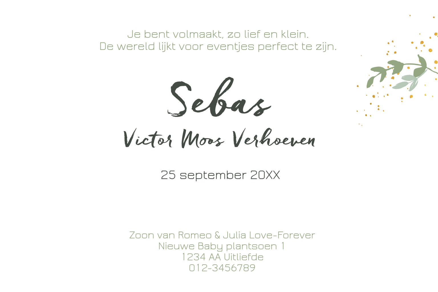 Hip geboortekaartje voor je zoontje met natuurlijke takjes en goudlook verf spetters op een donkergroene achtergrond.