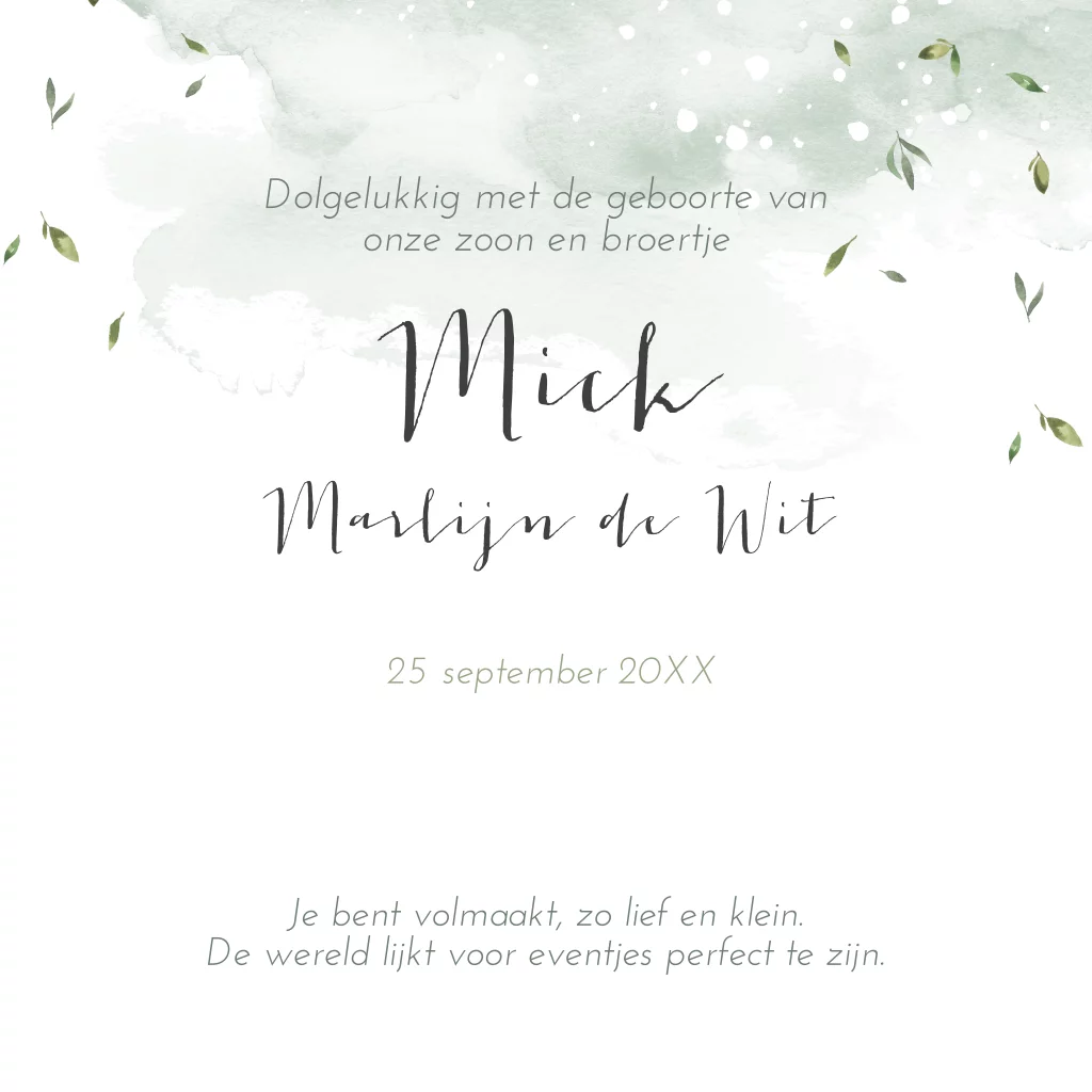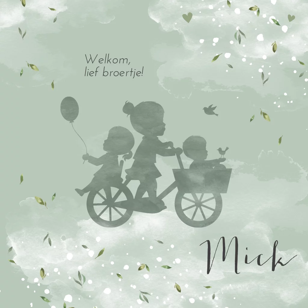 Stoer silhouet geboortekaartje voor de geboorte van je derde kindje. Met een hip silhouet van twee grote zussen die met hun baby broertje op de fiets zitten. De groen watercolor en vallende bladeren maken dit echt een hip geboortekaartje!