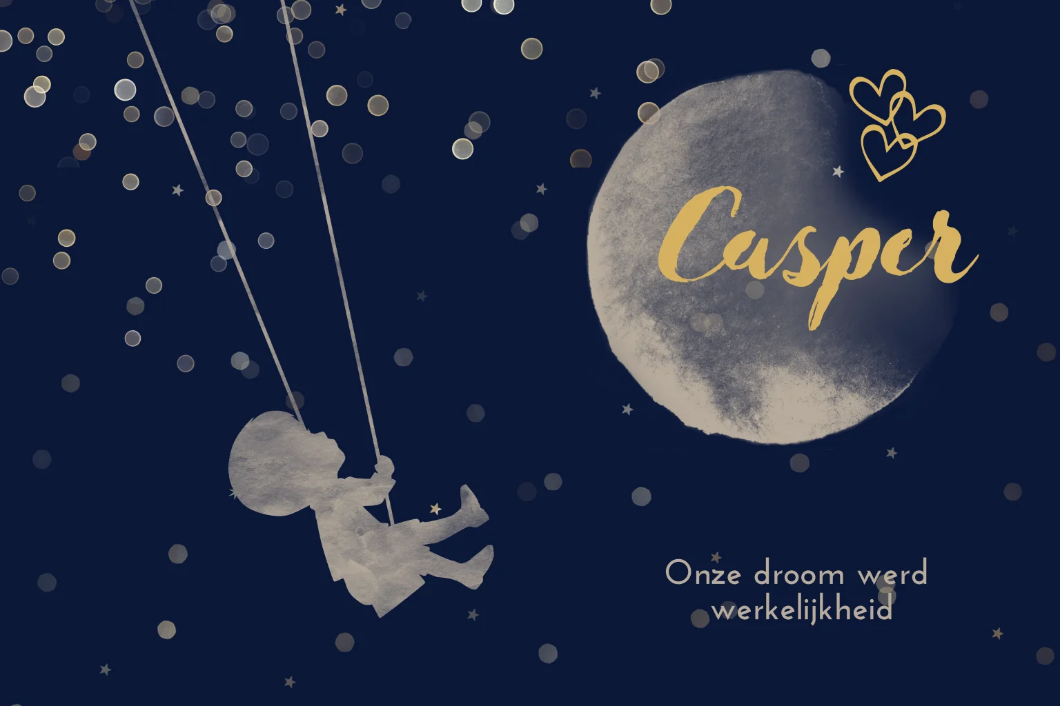 Hippe geboortekaart voor je pasgeboren zoon met een trendy silhouet van een jongetje die bij maanlicht aan het schommelen is. Met de grote maan op donkerblauw past dit geboortekaartje helemaal bij de huidige trend!