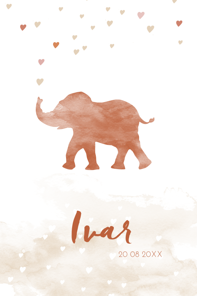 Dit lieve geboortekaartje met een aquarel silhouet van een olifant kun je helemaal naar wens vormgeven door het andere kleuren te geven. Het olifantje staat op een ondergrond van bruine waterverf, uit zijn slurf komen hartjes. Klik op 'bewerk deze kaart' en pas de kleuren, teksten en lettertypes gemakkelijk aan in de online editor.