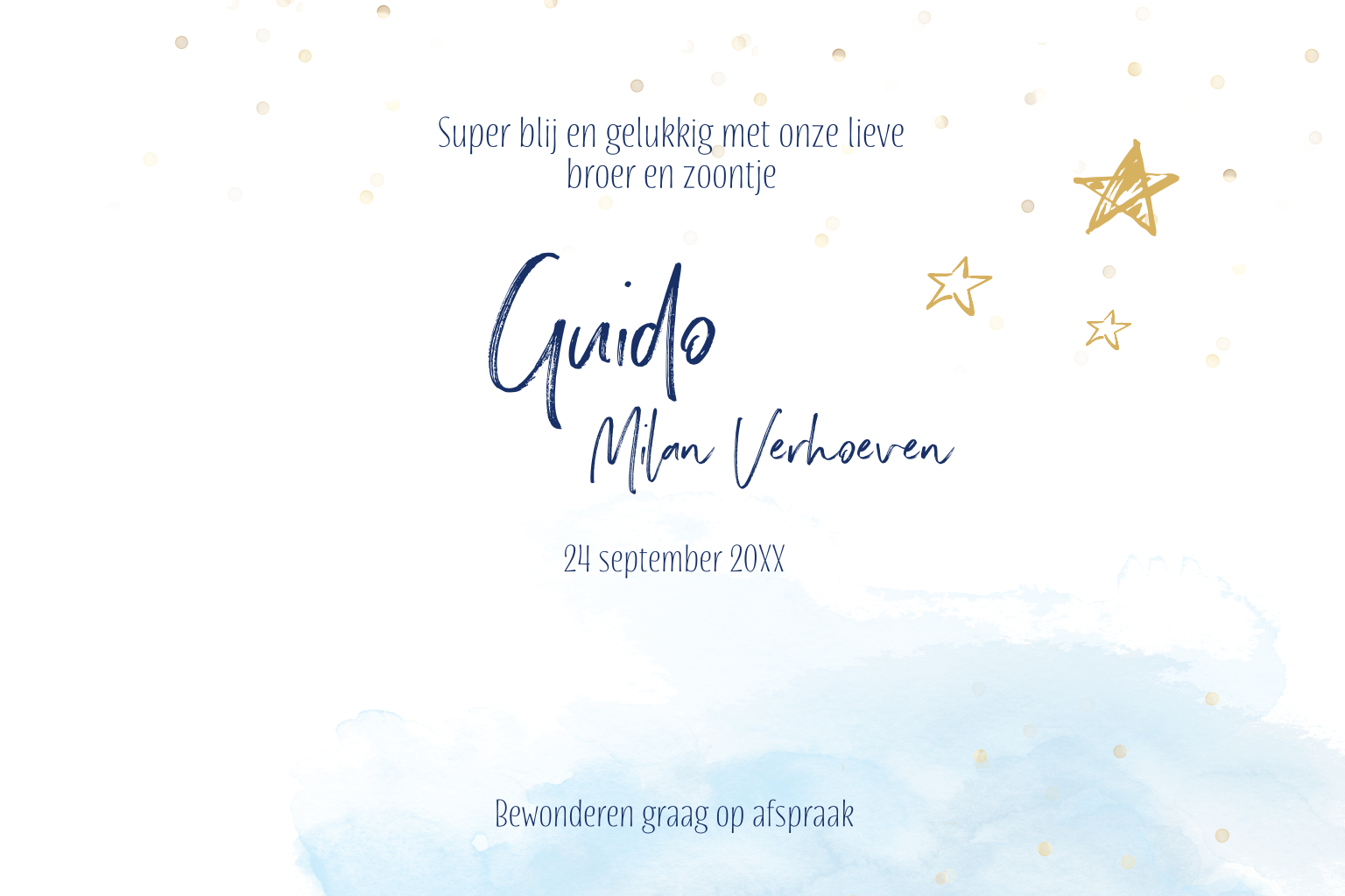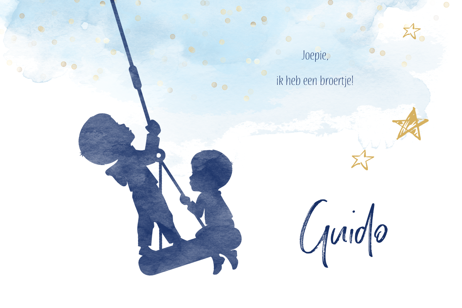 Hippe geboortekaart voor de geboorte van je tweede zoontje met een blauw watercolour silhouet van een baby broertje met zijn grote broer samen op de schommel. De goudlook sterretjes maken dit echt een stoer geboortekaartje!