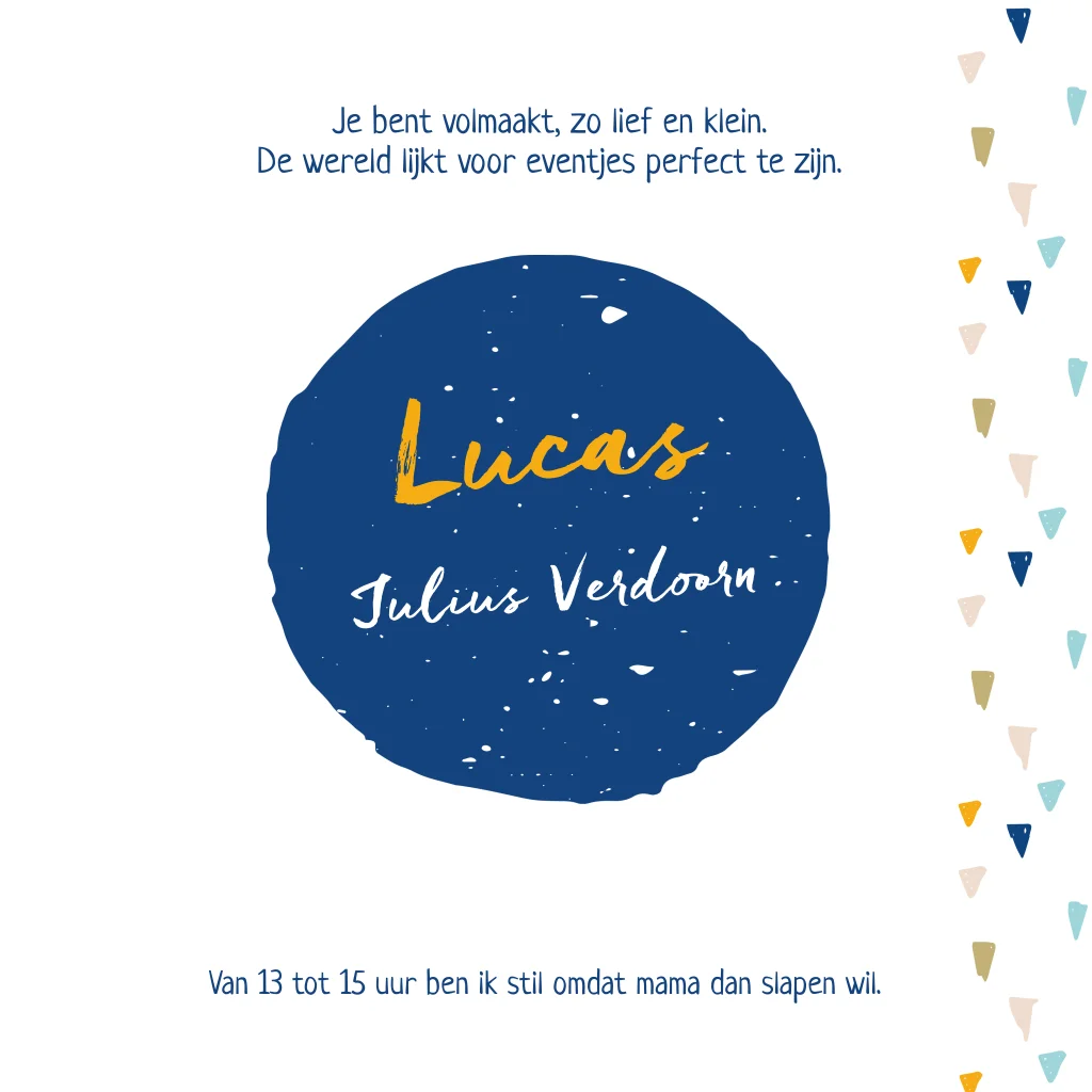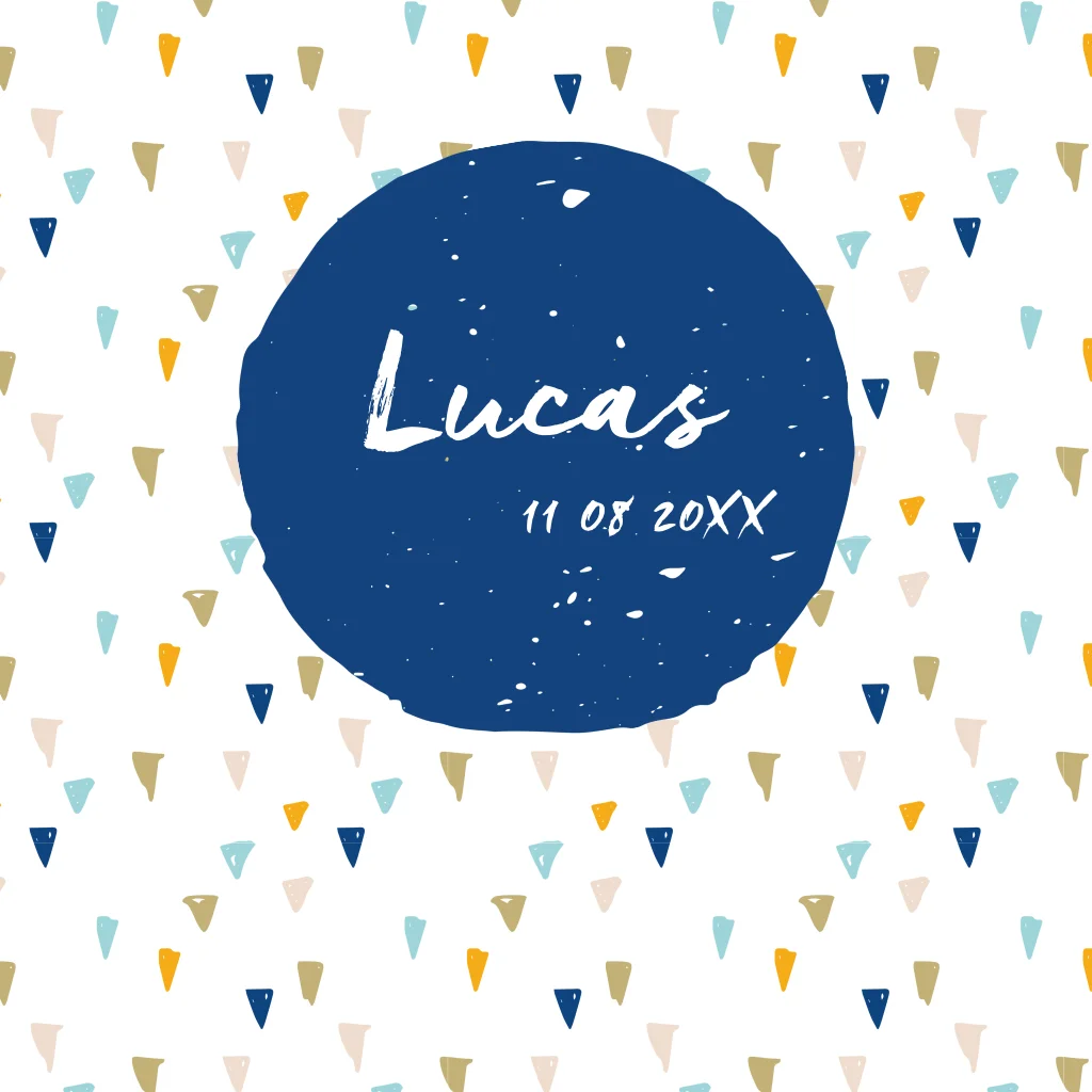 Een vrolijk en feestelijk geboortekaartje! De achtergrond is versierd met gekleurde driehoekjes en in de blauwe cirkel kun je de naam van jouw baby zetten. Dit is een ontwerp van JilleJille. Iets voor jou? Bestel een proefdruk voor slechts 1€!