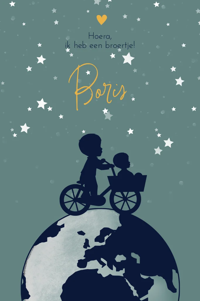 Trendy geboortekaart met de silhouetten van een klein broertje met zijn grote broer op de fiets op de wereld onder de sterrenhemel. Deze kaart kun je personaliseren naar jouw eigen gezinssituatie.