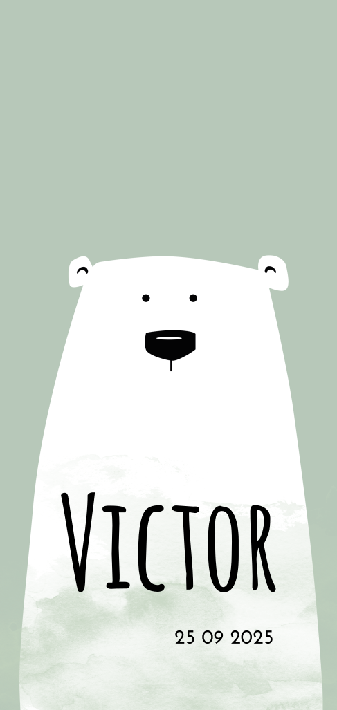 Stoer geboortekaartje voor je zoontje met een lieve illustratie van een stoere ijs beer op een olijfgroene achtergrond. Liever een andere achtergrondkleur? Pas het eenvoudig aan in de online editor.