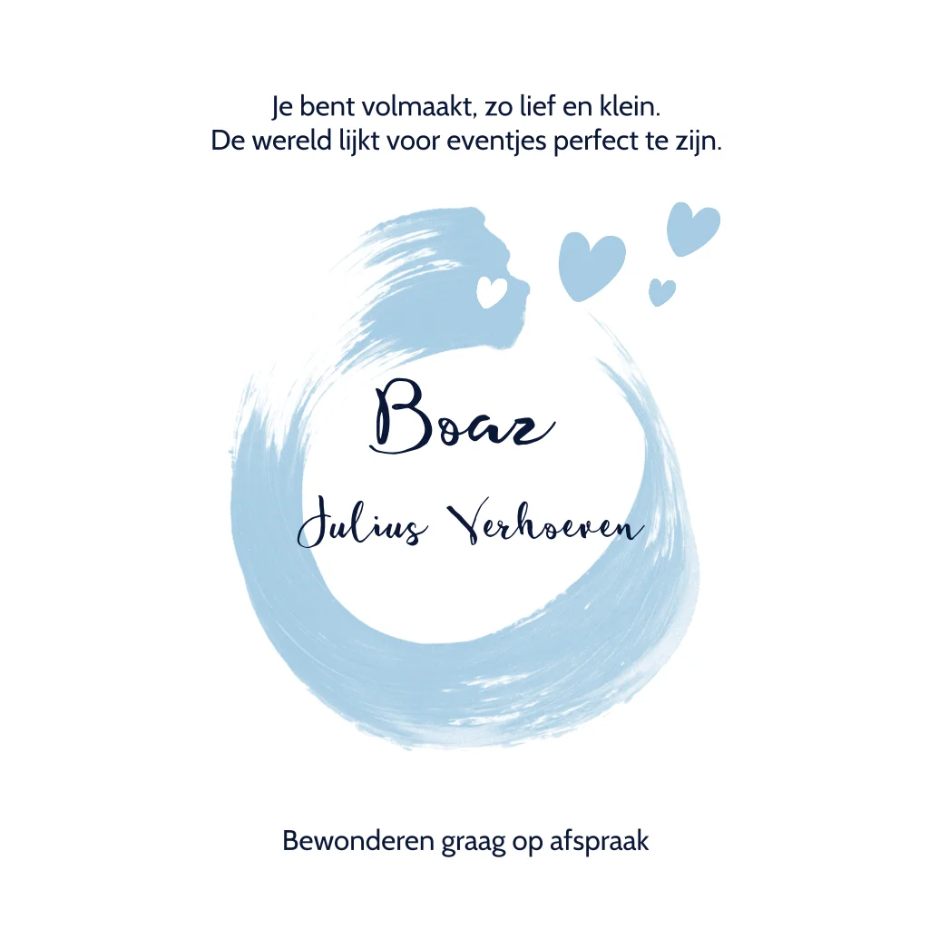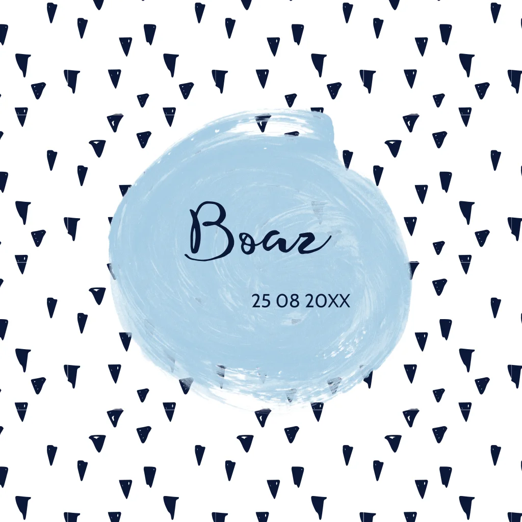 Hip geboortekaartje voor je pasgeboren zoontje! Met een verfstip en een dessin van getekende driehoekjes. Kleuren en lettertypes zijn zelf uit de kiezen in de online editor. Maak er een feestelijke kaart van!
