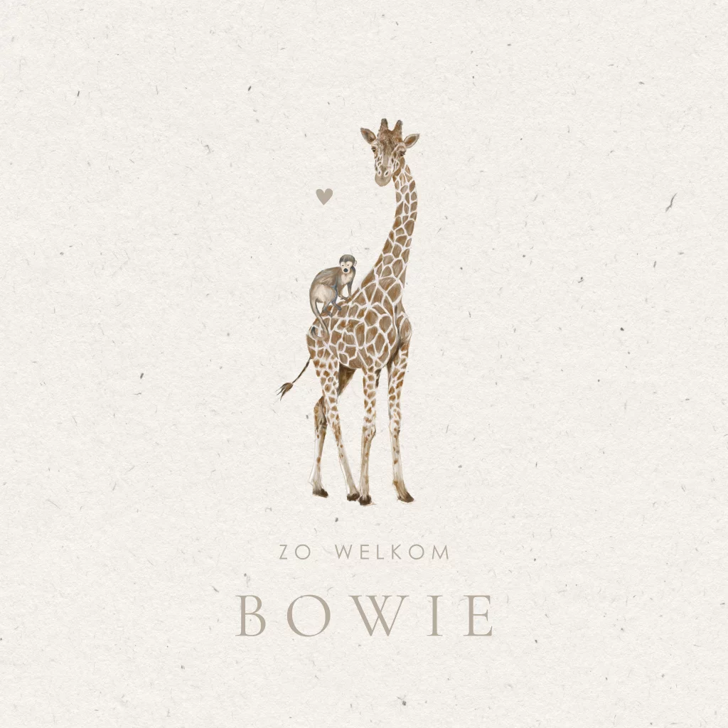 Een hip geboortekaartje voor jouw kindje. Het vierkante kaartje heeft een vezel achtergrond met daarop een mooie illustratie van een giraf met een aapje op de rug. De naam en teksten zijn hier in een neutrale kleur gedrukt maar deze kunnen ook in goud of koperfolie.