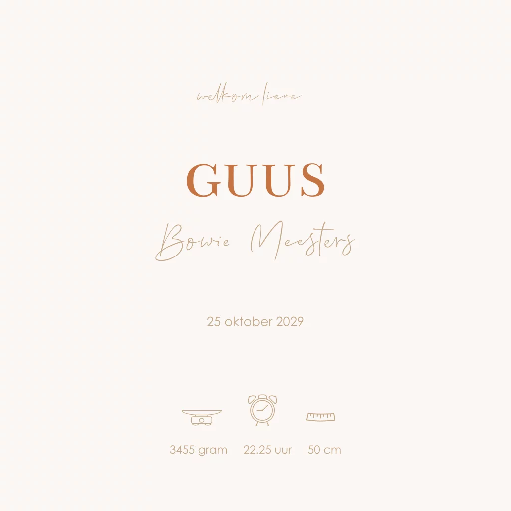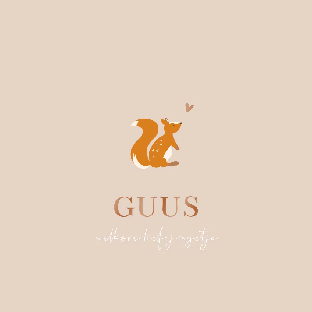 Opzoek naar een schattig herfst geboortekaartje? Dit unisex geboortekaartje heeft een kleine en schattige illustratie van een eekhoorn. De naam wordt hier gedrukt in hoogglans. Pas alles naar wens aan in onze online editor.