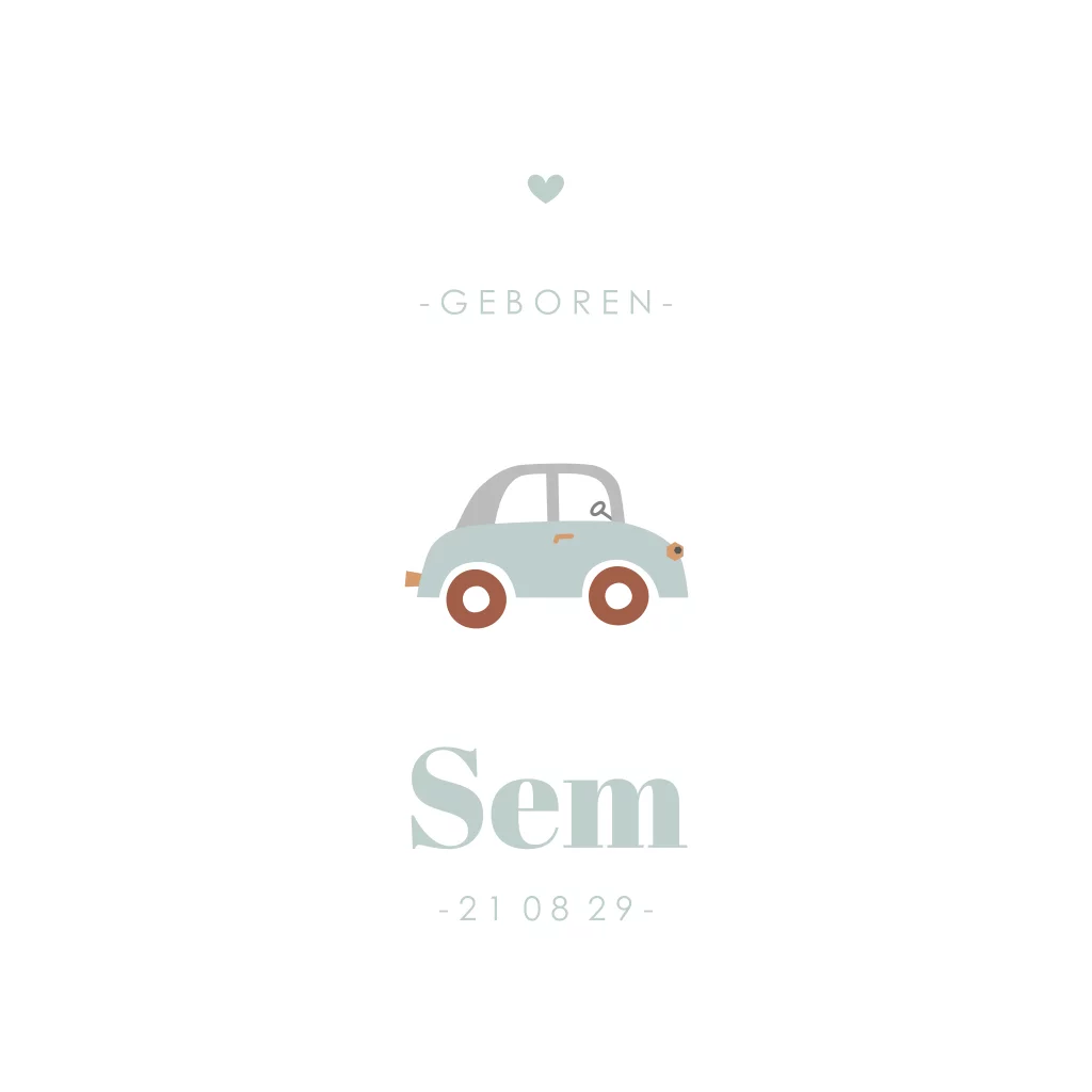 Dit is een hip kaartje met een autootje voor de geboorte van jullie zoontje. Deze enkele kaart heeft ronde hoeken en heeft een leuke illustratie van een auto'tje. De zachte tinten van de illustratie geeft een rustig beeld. Pas het kaartje naar wens aan in onze online editor en bestel snel een proefdruk om dit kaartje in het echt te zien!