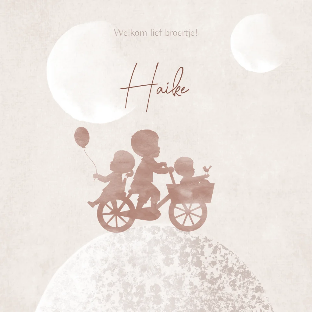 Lief geboortekaartje voor de geboorte van jullie zoontje als derde kindje. Het kaartje heeft een watercolour silhouet van een jongetje met een broertje en zusje op de fiets. De drie kindjes fietsen over een wereldbol van bloemen met twee maantjes boven zich. De combinatie van de bruine tinten op een beige velvet achtergrond maken dit een sfeervol kaartje.