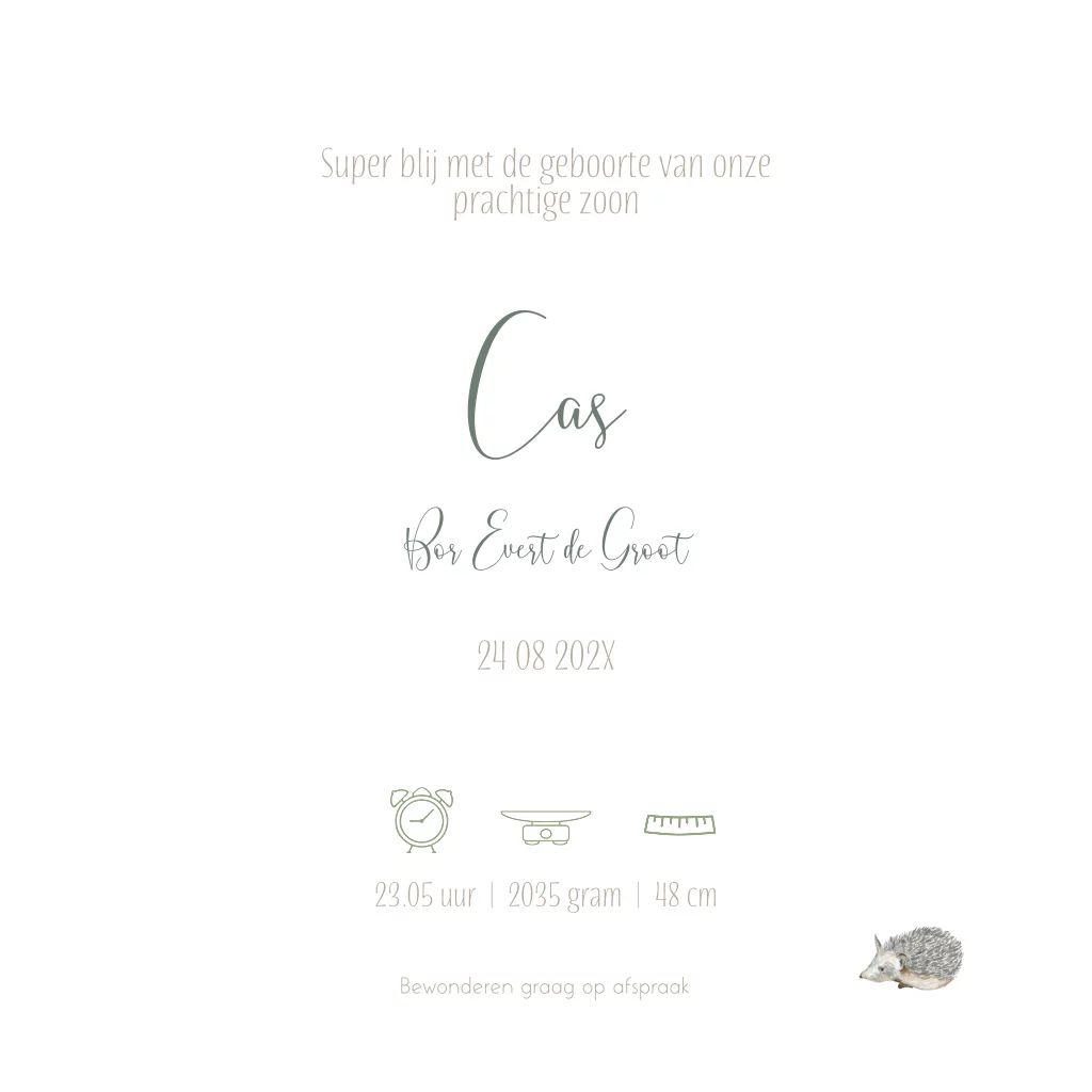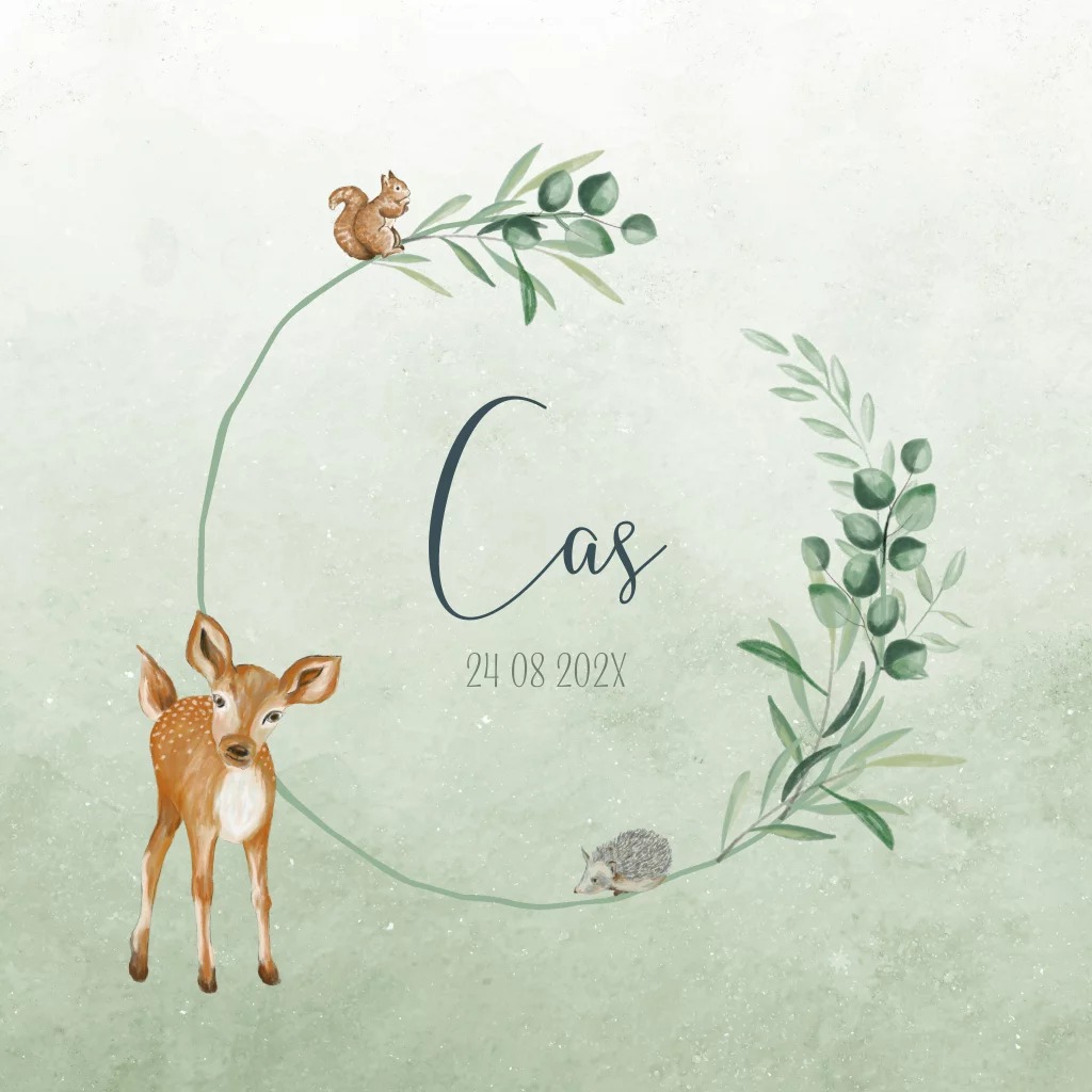 Lief geboortekaartje voor de geboorte van jullie kindje. Het kaartje heeft als achtergrond een groen verloop van watercolour met een geschilderde bladeren krans en illustraties van bosdieren. De bosdieren zijn een hertje, een eekhoorn en een egeltje. De naam van jullie kindje staat in het midden van het kaartje. Pas de naam of het kaartje gemakkelijk en snel aan in onze online editor.