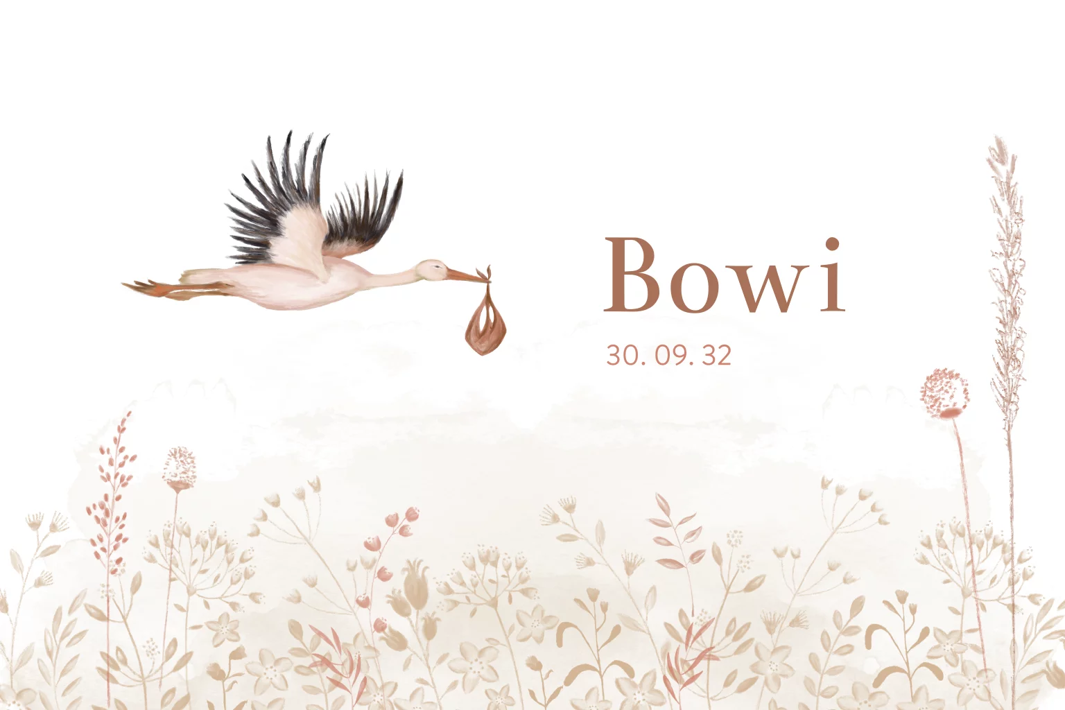 Neutraal geboortekaartje met ooievaar en veldbloemen