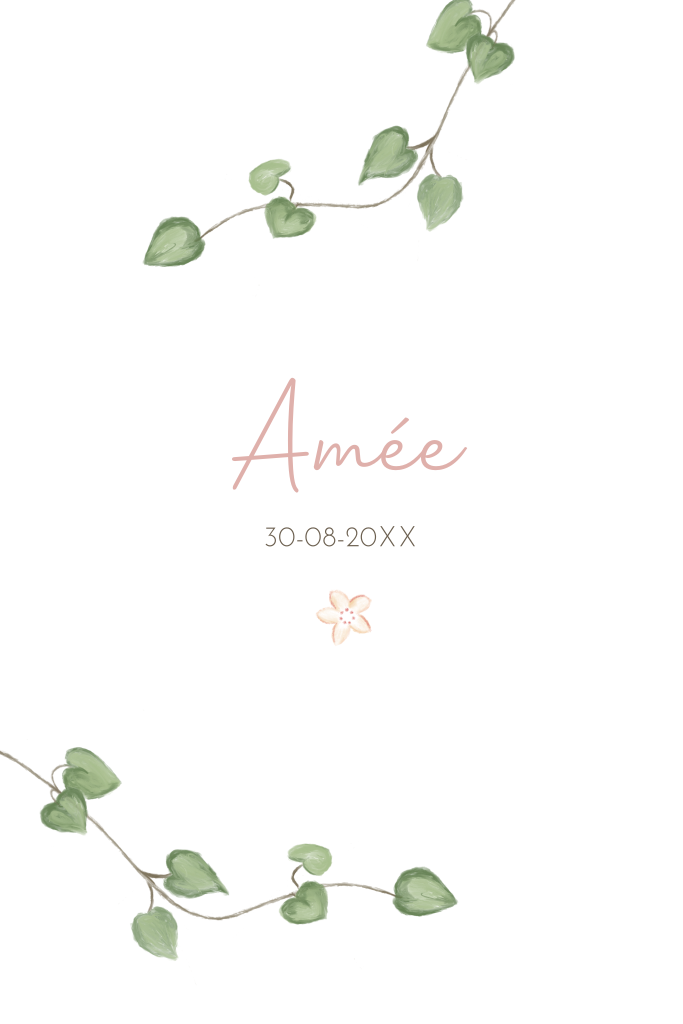 Lieve geboortekaart met een hand getekend bloemetje en takje met groene kleine blaadjes.