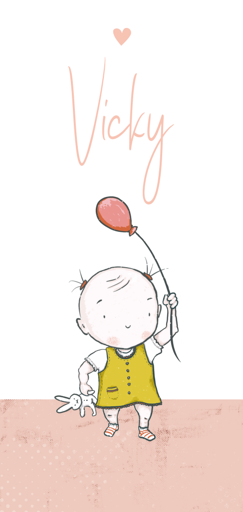 Vrolijke geboortekaart met een stoer meisje met in haar ene hand een ballon en in de andere hand een konijntje. Dit kaartje heeft een ontzettend lieve uitstraling vanwege de aanwezige illustratie. Perfect voor de geboorte van jullie mooie dochter.