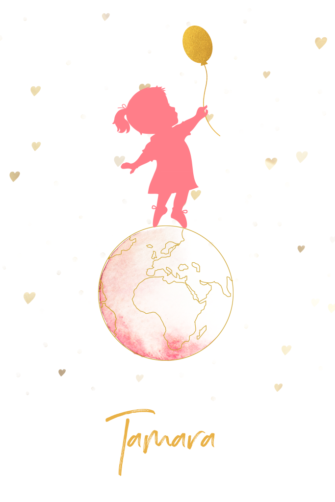 Wat een lief geboortekaartje met een silhouet van een vrolijk meisje met ballon op een wereldbol! Tof is dat de opvallende, neonroze kleur van het meisje ook in de wereldbol terugkomt. Met de hartjes op de achtergrond is dit lieve kaartje helemaal compleet! Leuk te combineren met een gekleurde envelop.