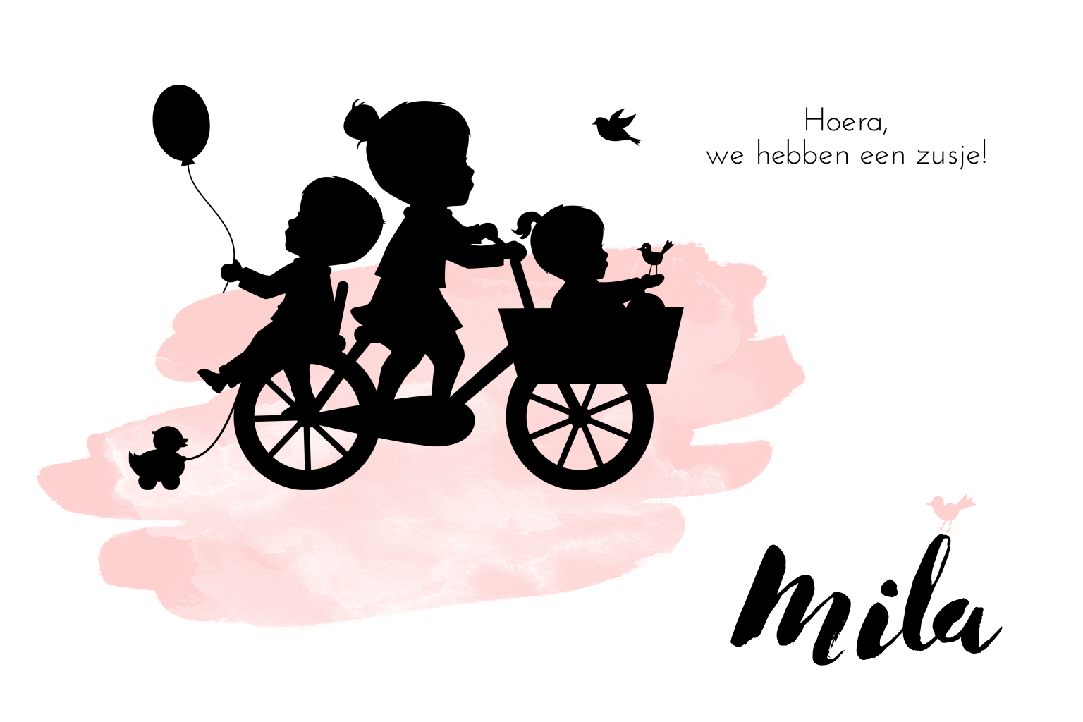 Hoera, we hebben een zusje! Dit vrolijke geboortekaartje is leuk voor de geboorte van een 3e kindje dat een meisje is. De drie kindjes zitten op de fiets met een ballon, vogels en een lief speelgoedeendje. De roze waterverf maakt hem helemaal af! Iets voor jouw dochter?