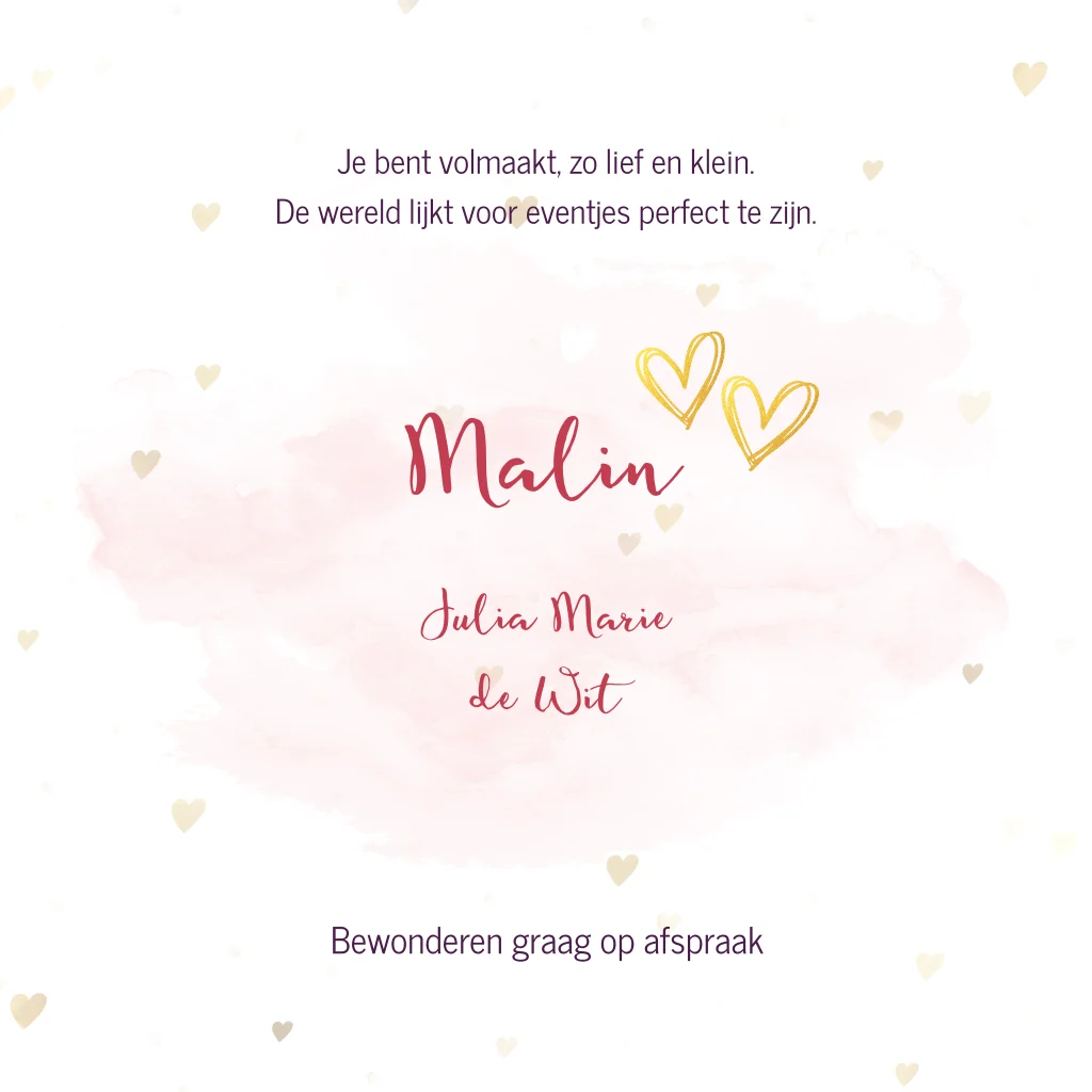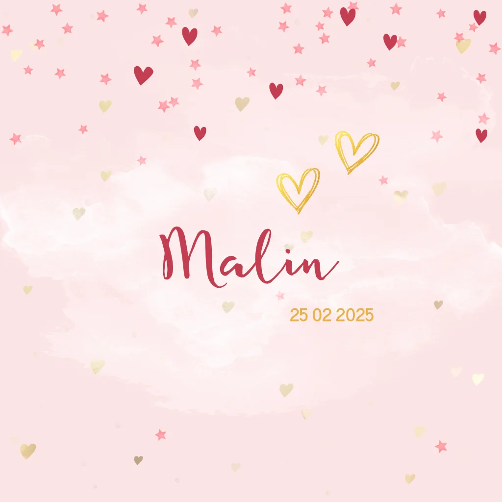 Schattig geboortekaartje voor een klein lief meisje met roze waterverf, sterretjes en hartjes in goudlook. Geef het geboortegewicht en de lengte van je kindje aan met hippe icoontjes.