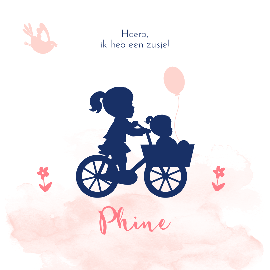Lief geboortekaartje voor meisje met silhouet zusjes op de fiets