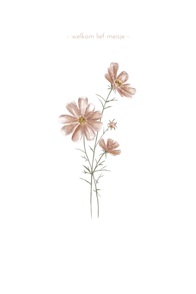 Een romantisch geboortekaartje met zachte ronde hoeken. Het kaartje heeft een een getekende goudsbloem. Daarnaast zie je verschillende roségoudfolie details. De naam van jullie kleintje kun je zelf typen met een lettertype naar eigen keuze.