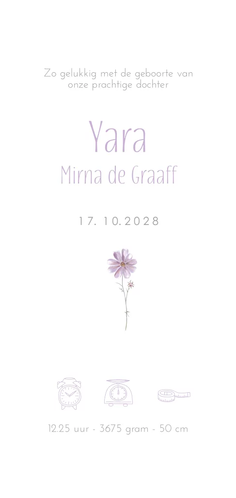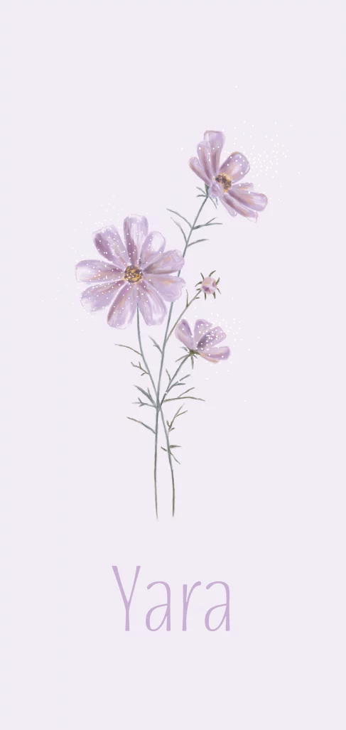 Een vrolijk en stijlvol geboortekaartje voor jouw kindje. Het langwerpige kaartje heeft een paarse achtergrond met prachtige watercolour bloemen. Ook heeft het kaartje mooie goudfolie details. Pas het ontwerp naar wens aan in onze online editor.