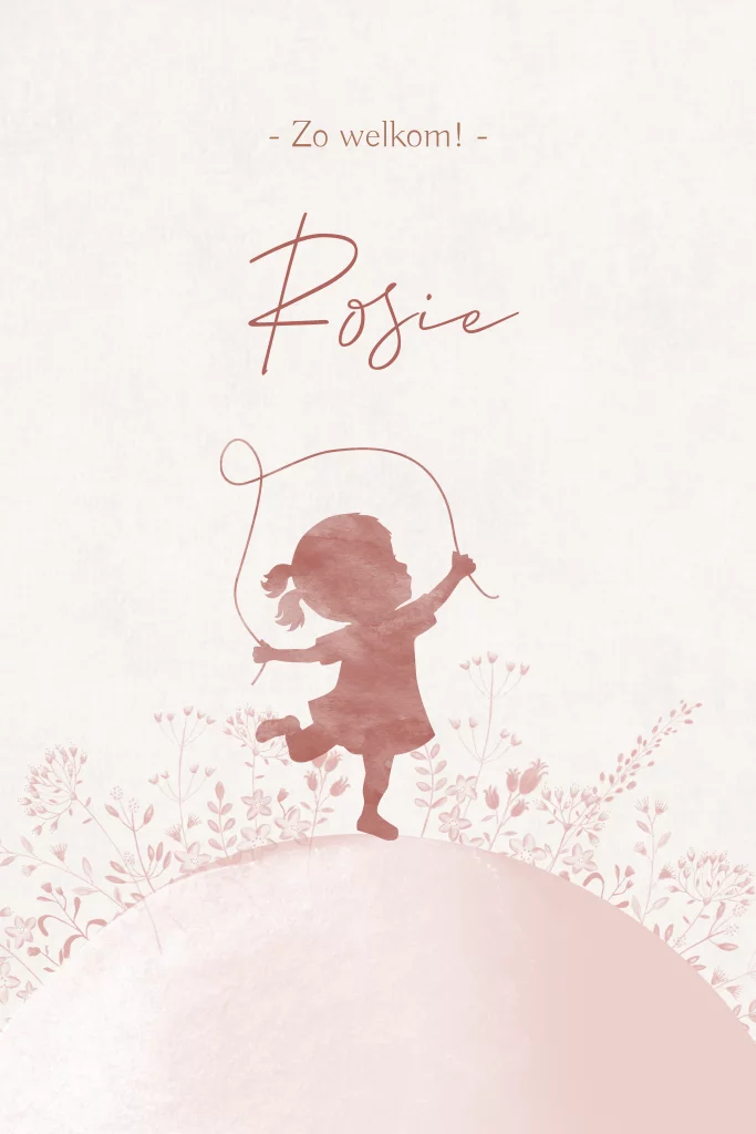Een schattig geboortekaartje voor een dochtertje. Het kaartje heeft een roze watercolour basis met daarop een silhouetje van een meisje met een springtouw op de wereldbol.